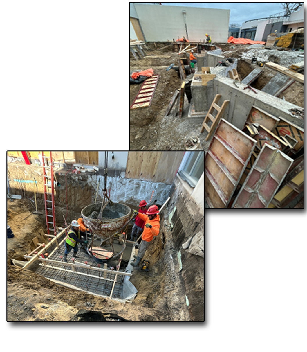 - In the pre-function addition located within the courtyard, crews installed foundations just ahead of winter conditions in late November. Photos on this page highlight the foundation wall in progress and the careful placement of the elevator pit slab.